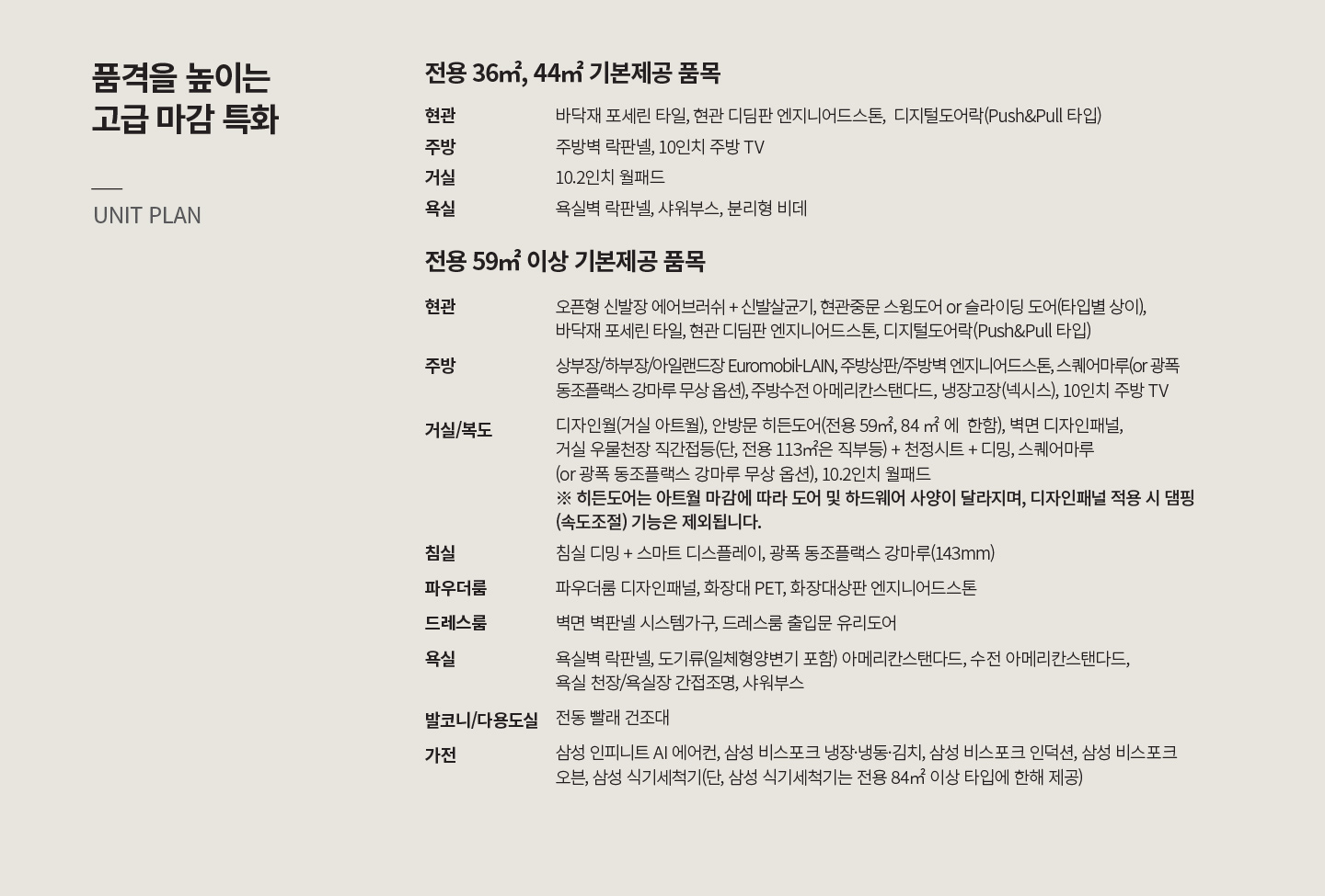 ※ 상기 마감재 품목은 자재 품절, 품귀, 생산중단, 제조회사의 도산 등의 부득이한 경우와 사업자의 시공여건 또는 신제품의 개시에 따라 동급, 동가 이상의 타사제품으로 변경될 수 있습니다.